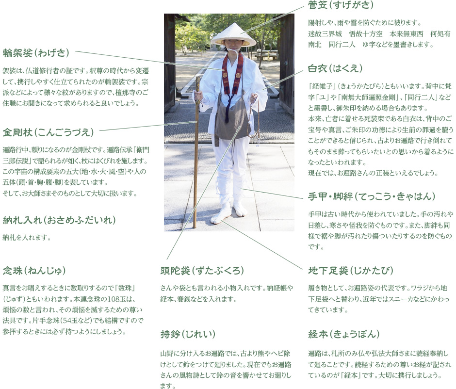 お遍路をする際に伝統的な善き「遍路姿」になるための身支度についてご説明します。服装は、まずは白衣に念珠、納め札程度ではじめ、次第に揃えていくのもよいでしょう。四国をお遍路された経験があれば、同様の準備で大丈夫です。